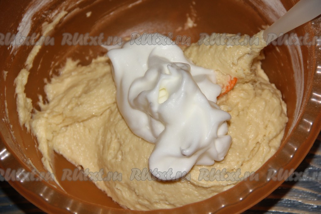 В отдельной ёмкости взбить миксером яичный белок до стойких пиков, а затем добавить в тесто.