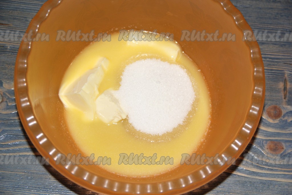 Сливочное масло слегка растопить (можно использовать размягченное масло). Соединить масло и сахар, взбить миксером в течение 3 минут.
