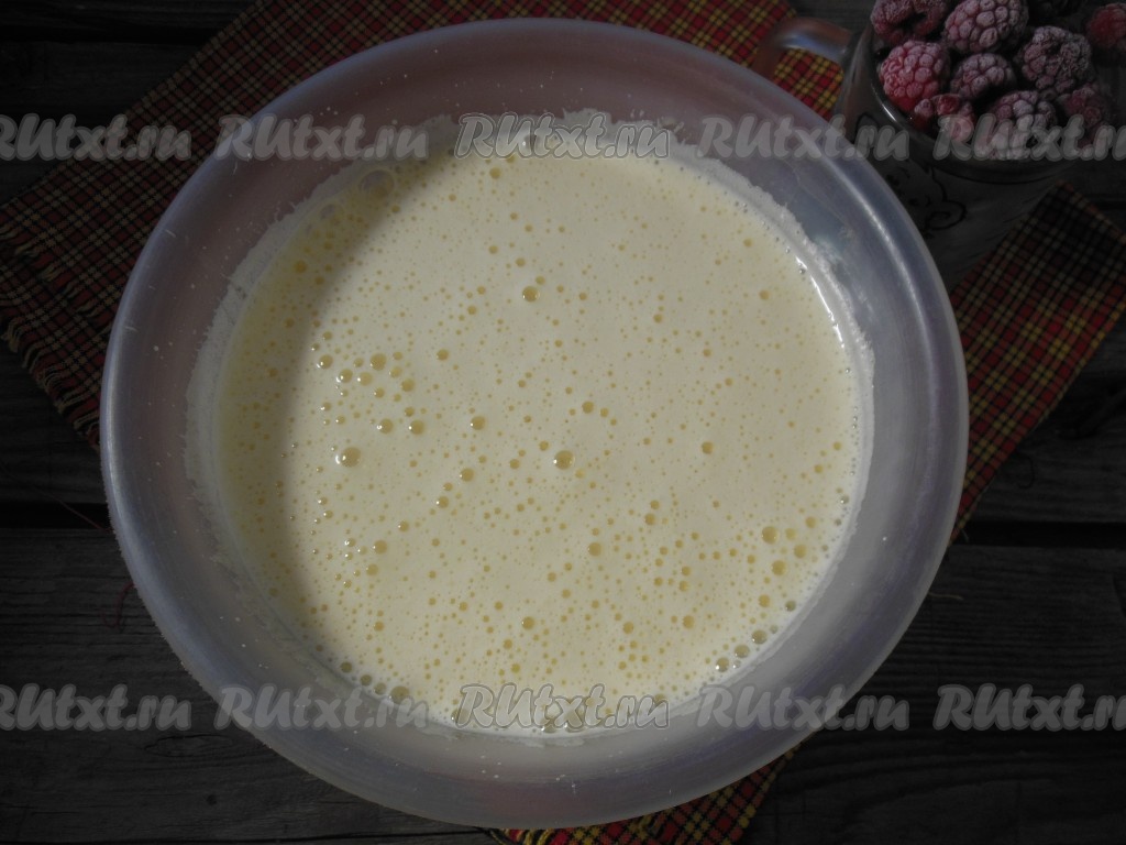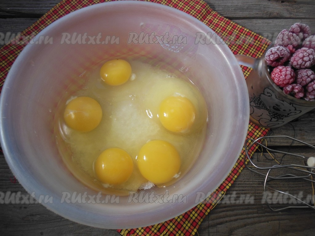 Соедините в миске сахар и яйца, взбейте их миксером в течение 4 минут.