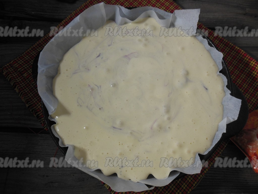 Форму для выпечки (я выпекаю шарлотку в толстостенной чугунной сковороде диаметром 26 см) застелите пергаментной бумагой (или смажьте сливочным маслом). В форму для выпечки вылейте тесто и отправьте в разогретую духовку.