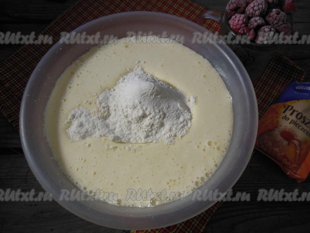 Затем в сахарно-яичную массу всыпьте просеянную муку вместе с разрыхлителем.