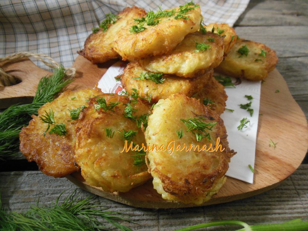 Готовые аппетитные, румяные постные драники из картошки перекладывайте со сковороды на бумажное полотенце, чтобы удалить лишний жир, и жарьте остальные драники. На фото показано количество драников, которое получилось у меня из указанного количества ингредиентов.