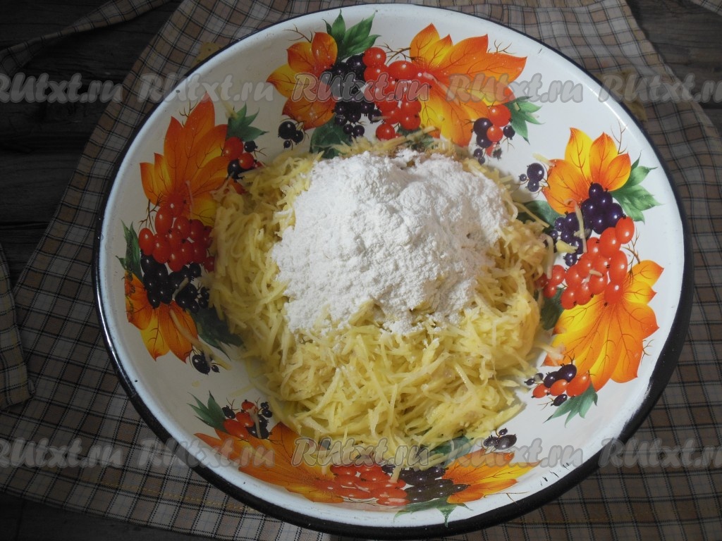 Теперь, для того чтобы скрепить картофельное тесто, всыпьте муку. Много муки не добавляйте, чтобы не забить тесто.