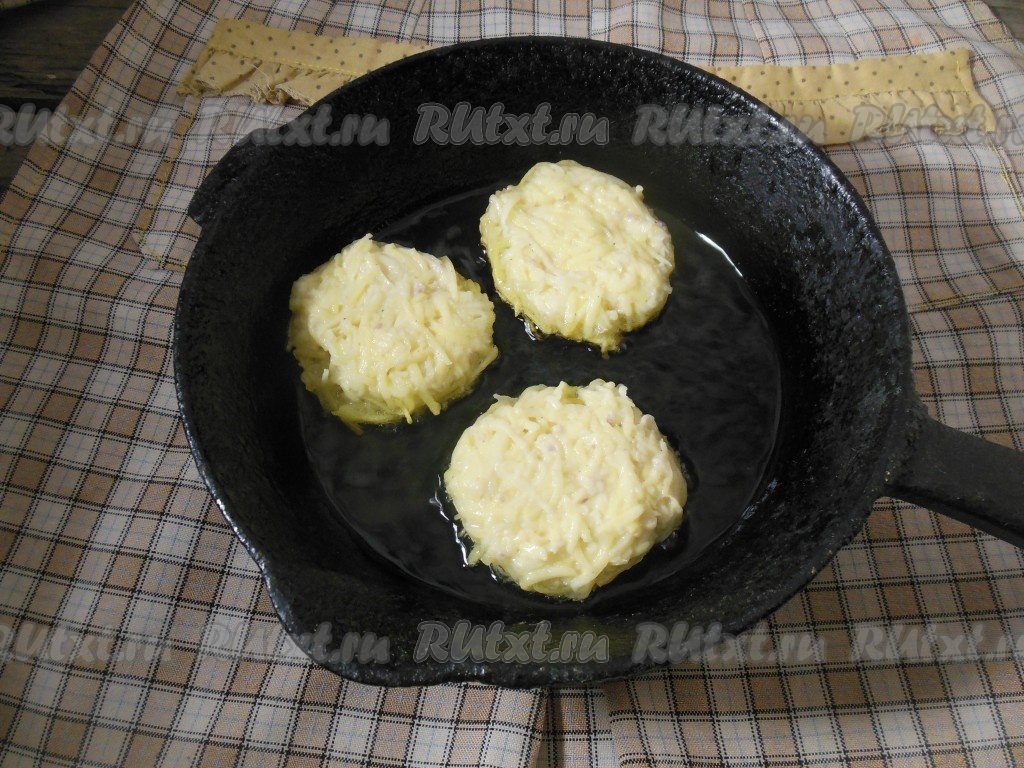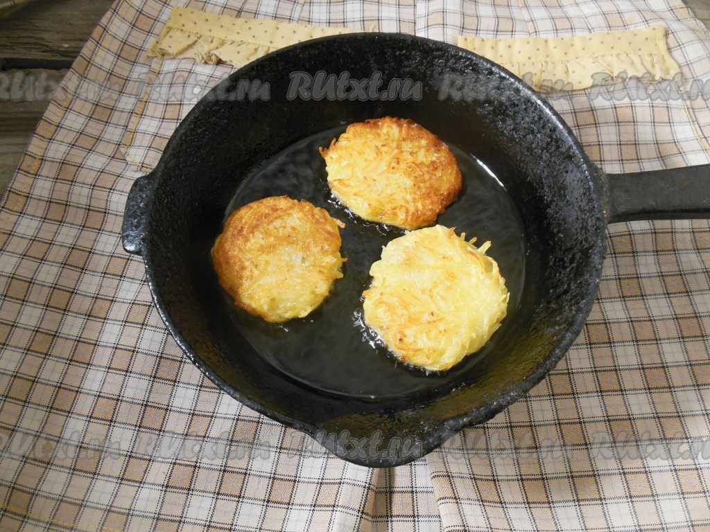 Жарятся драники с двух сторон до золотистой корочки (в зависимости от толщины драников они жарятся, примерно, по 3-4 минуты с каждой стороны).