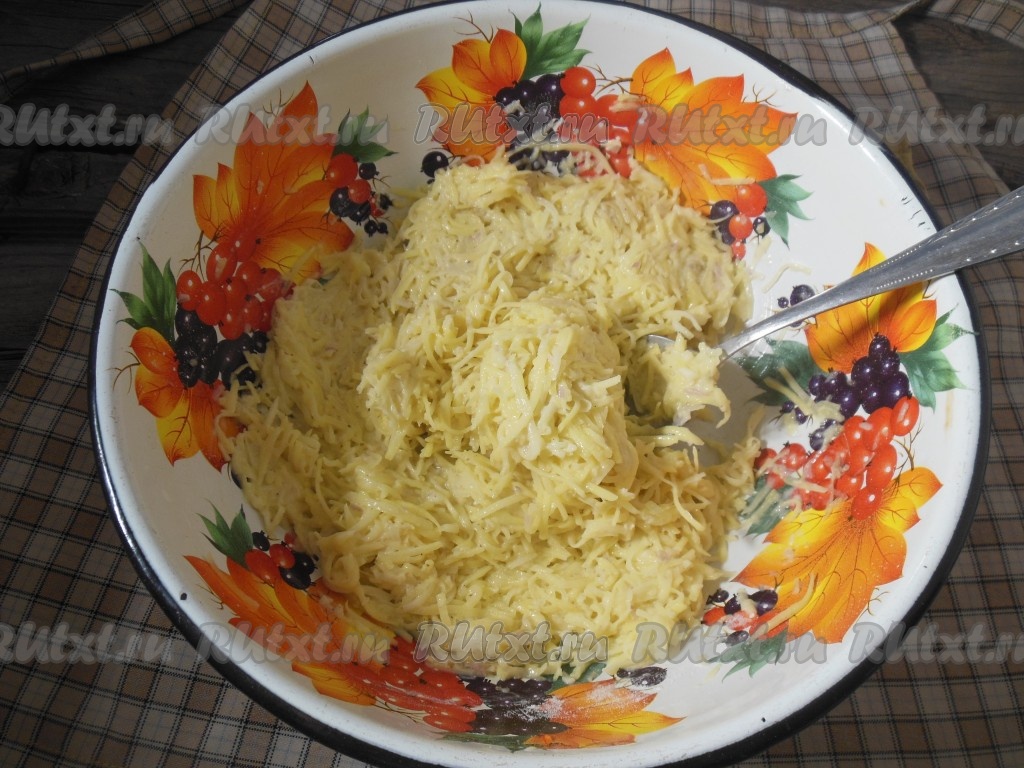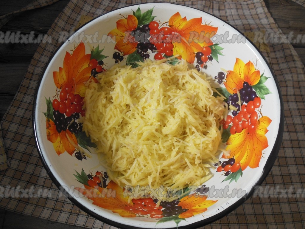 Затем на этой же терке натрите картофель, стараясь перемешивать его с уже натертым репчатым луком.