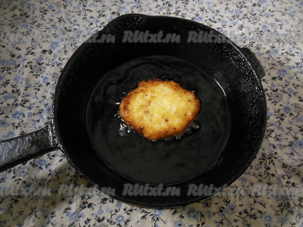 Хорошо разогрейте сковороду с растительным маслом. Столовой ложкой выкладывайте тесто, формируя круглые оладушки. Жарьте драники на медленном огне по 2-3 минуты с каждой стороны (до румяной корочки).