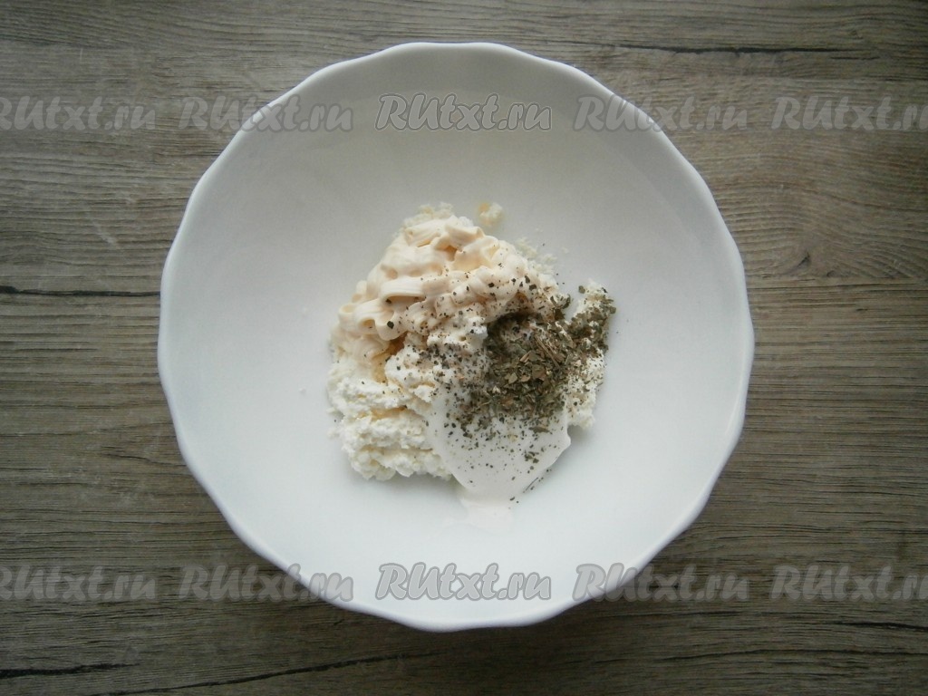 В творог добавить плавленный сыр, сметану, соль, чёрный молотый перец и сушеный базилик.
