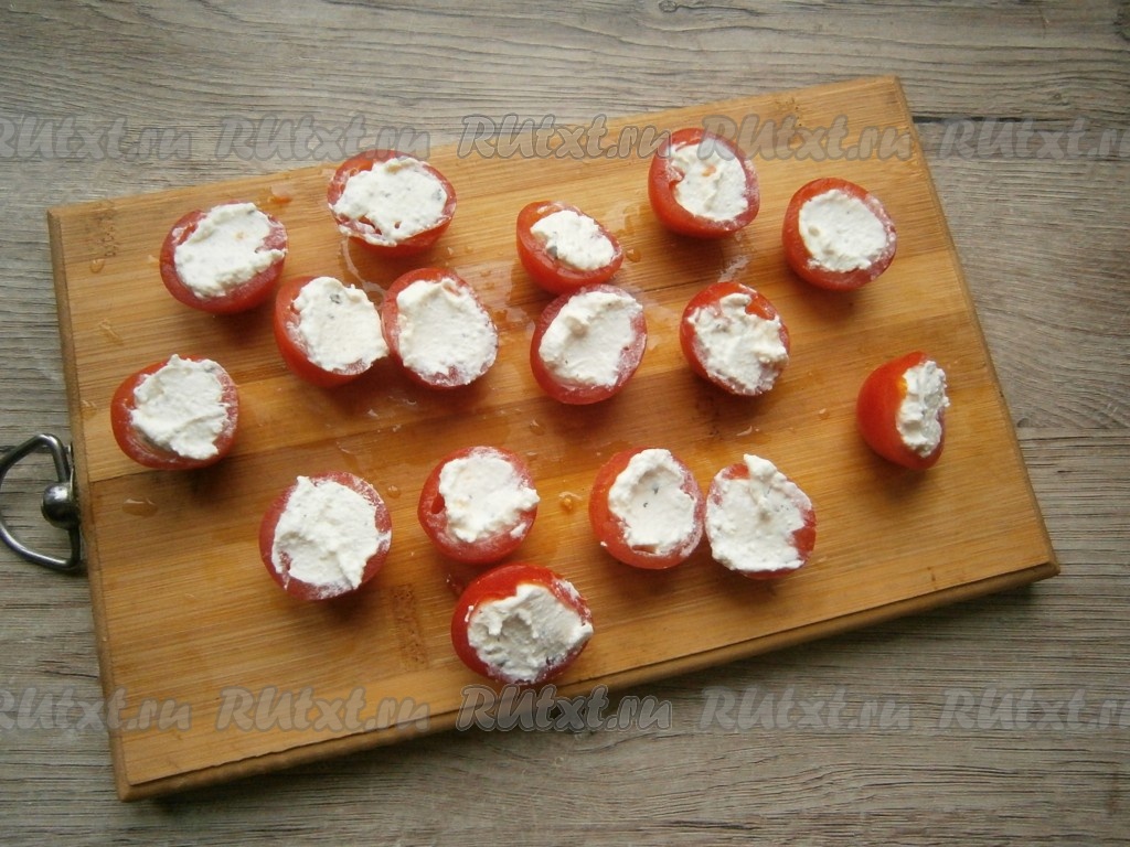 Наполнить половинки помидоров черри творожной массой.