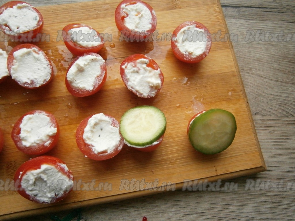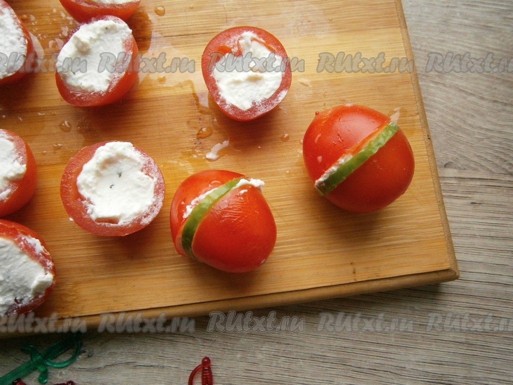 Половинку помидора с огурчиком сверху накрыть второй половинкой помидора с творогом (как на фото).
