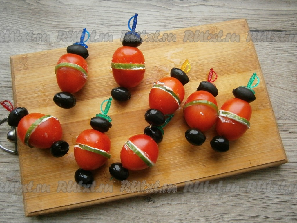 Нанизать каждый помидор на шпажку, разместив сверху и снизу помидорчика по оливке.