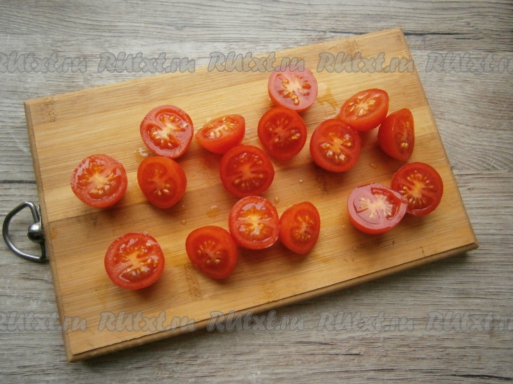 Удалить хвостики, разрезать помидорки пополам горизонтально.