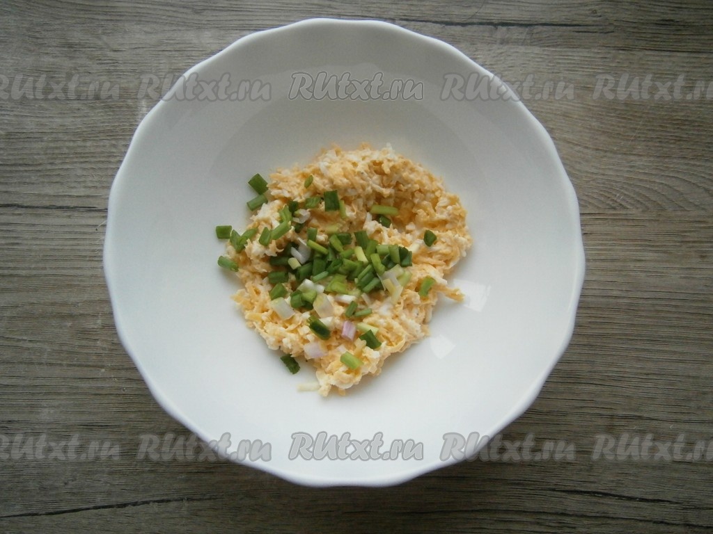Добавить натертое яйцо, пропущенный через пресс чеснок, майонез, соль и молотый перец, тщательно перемешать.
