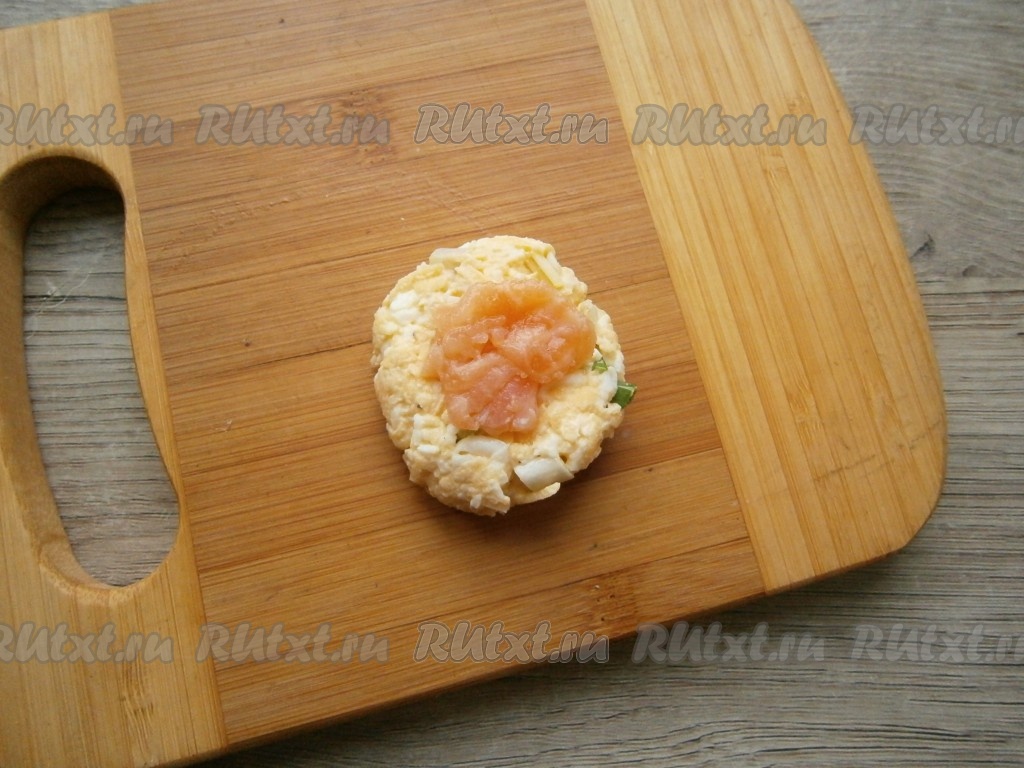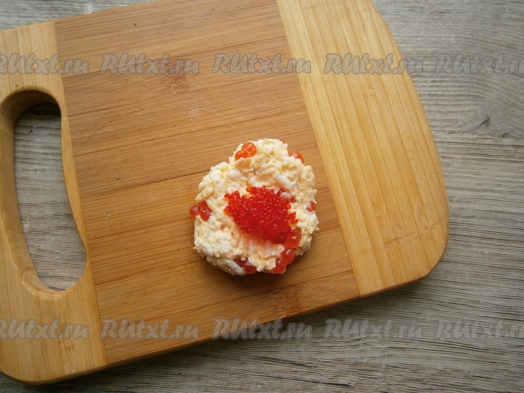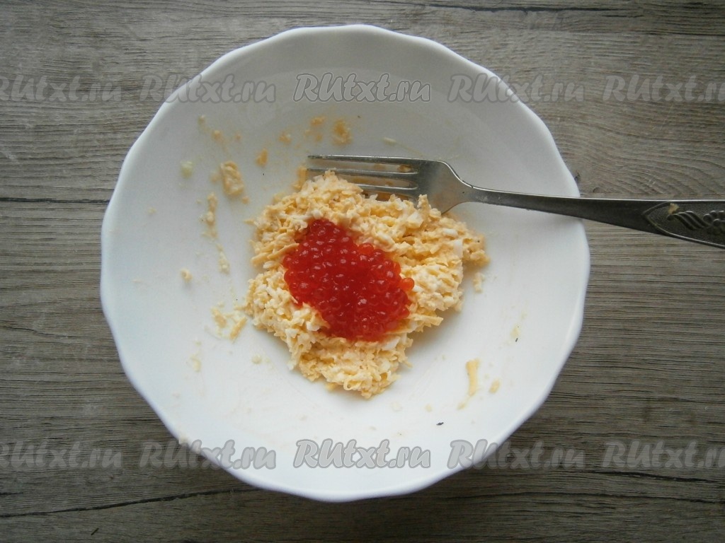 В оставшуюся часть сырной массы добавить красную икру лососевых рыб.