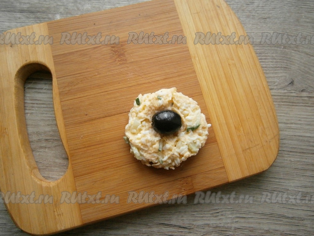 Массу перемешать, также сформировать шарики размером с грецкий орех (у меня получилось 4 шарика), тоже размять каждый шарик в лепешку, в середину которых поместить по оливке и сформировать шарики. Получится 4 сырных шарика с оливкой внутри.