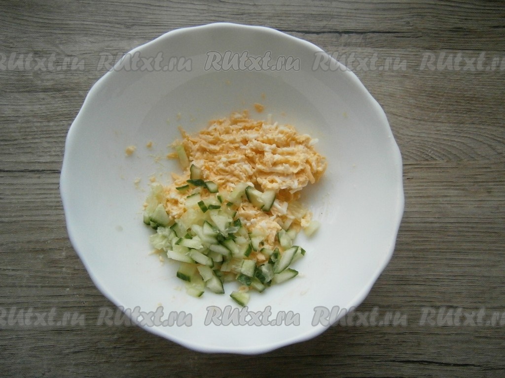 В другую часть сырной массы добавить нарезанный мелкими кубиками свежий огурец.