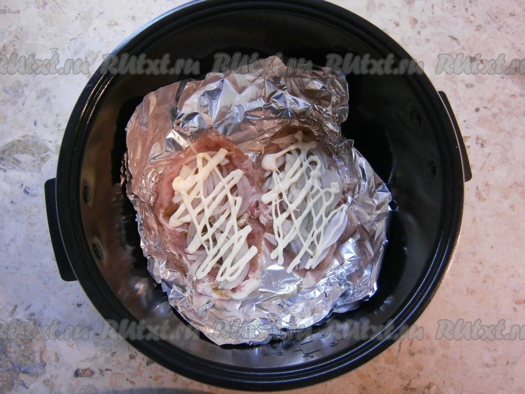 Чашу мультиварки застелить фольгой, смазать растительным маслом, выложить отбитое мясо. Сверху разместить очищенный и нарезанный тонкими полукольцами лук.