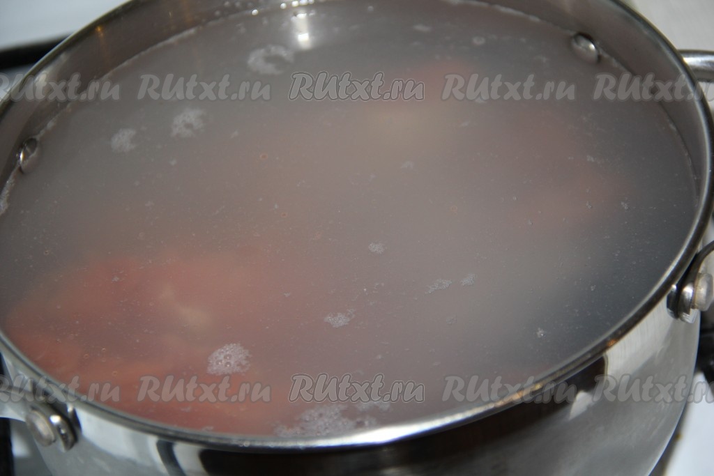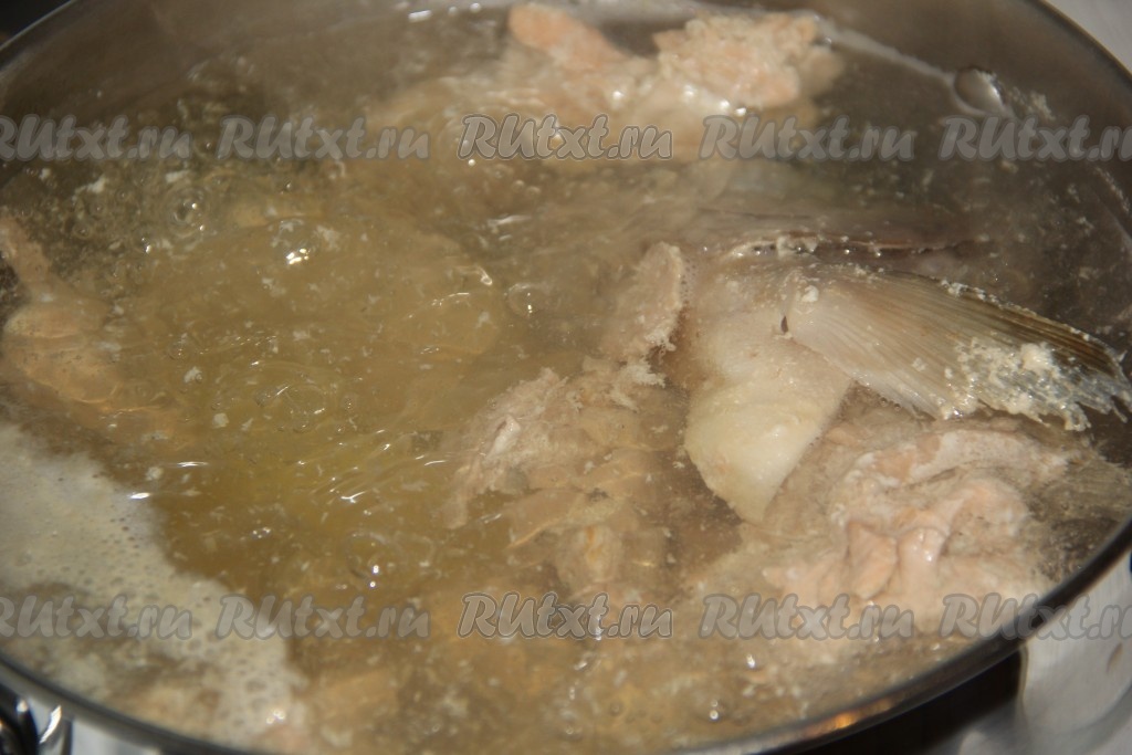 Залить рыбу 2,5 литрами холодной воды и поставить на огонь.