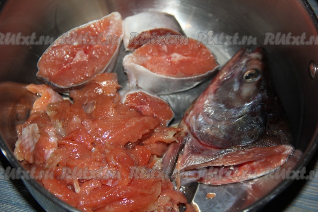 В кастрюлю выложить голову, хвост и филе горбуши.