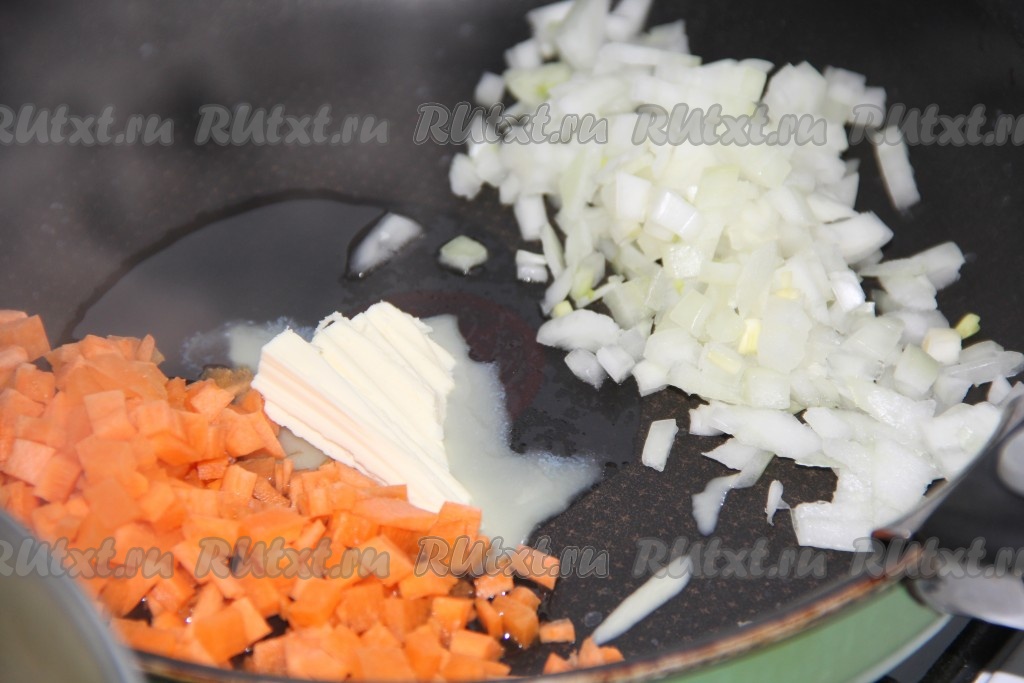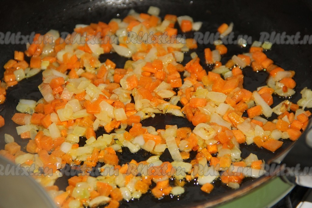 Очищенный лук мелко нарезать, очищенную морковь нарезать на мелкие кубики и вместе со сливочным маслом выложить в сковороду.