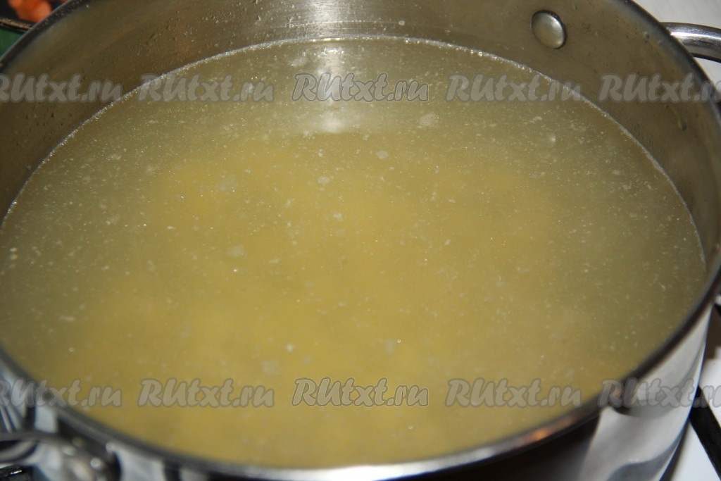 Процеженный бульон поставить на огонь и довести до кипения. Две очищенные картофелины нарезать на кубики и добавить в кипящий бульон, варить 10 минут на небольшом огне.