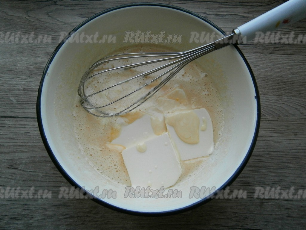 Тщательно взбить яично-медовую смесь венчиком, добавить размягченный маргарин или масло, перемешать яично-масляную смесь.
