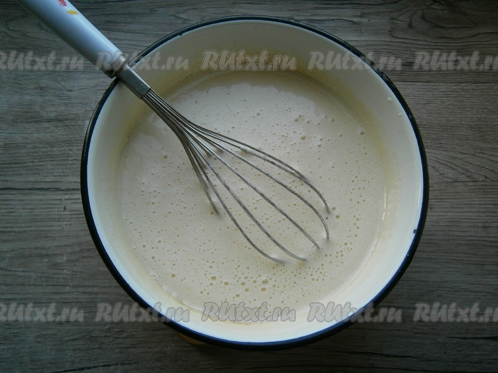 В кастрюлю большего объёма, чем миска с яично-масляной смесью, налить воду, поставить кастрюлю на огонь, довести воду до кипения, сверху поставить миску со смесью (дно миски не должно касаться воды), уменьшить огонь. Постоянно помешивая венчиком, довести яично-масляную смесь на водяной бане до кипения, но не давать ей кипеть. Смесь начнет увеличиваться под действием соды. Когда это произойдет, убрать миску с водяной бани.