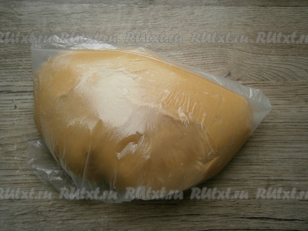 Замесить мягкое, но плотное, не липнущее тесто, которое поместить в целлофановый пакет и отправить в холодильник на 2-3 часа.