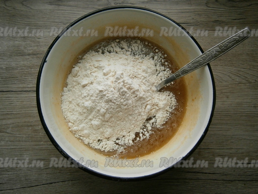 Дать смеси остыть до теплого состояния, периодически перемешивая ее венчиком, затем всыпать муку.