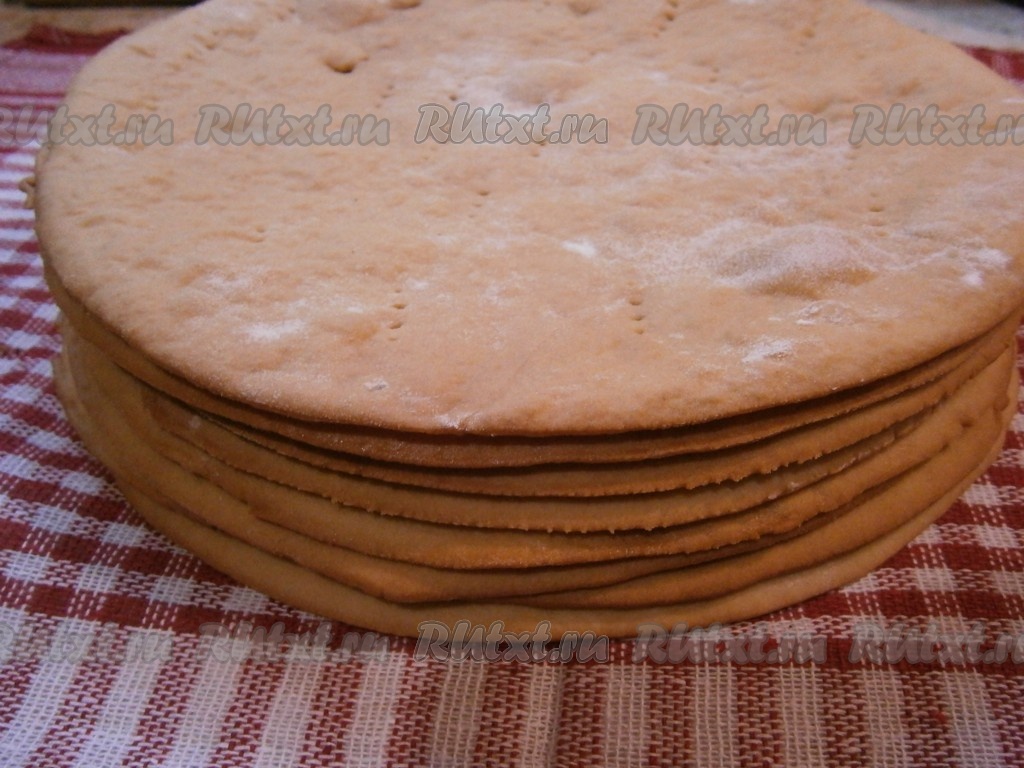 Перед выпечкой разделить тесто на 8-10 частей. Каждую часть теста раскатать на присыпанной мукой поверхности, выпекать корж на противне, застеленном пергаментом. Пока будете раскатывать и выпекать один корж, остальное тесто должно находиться в холоде.