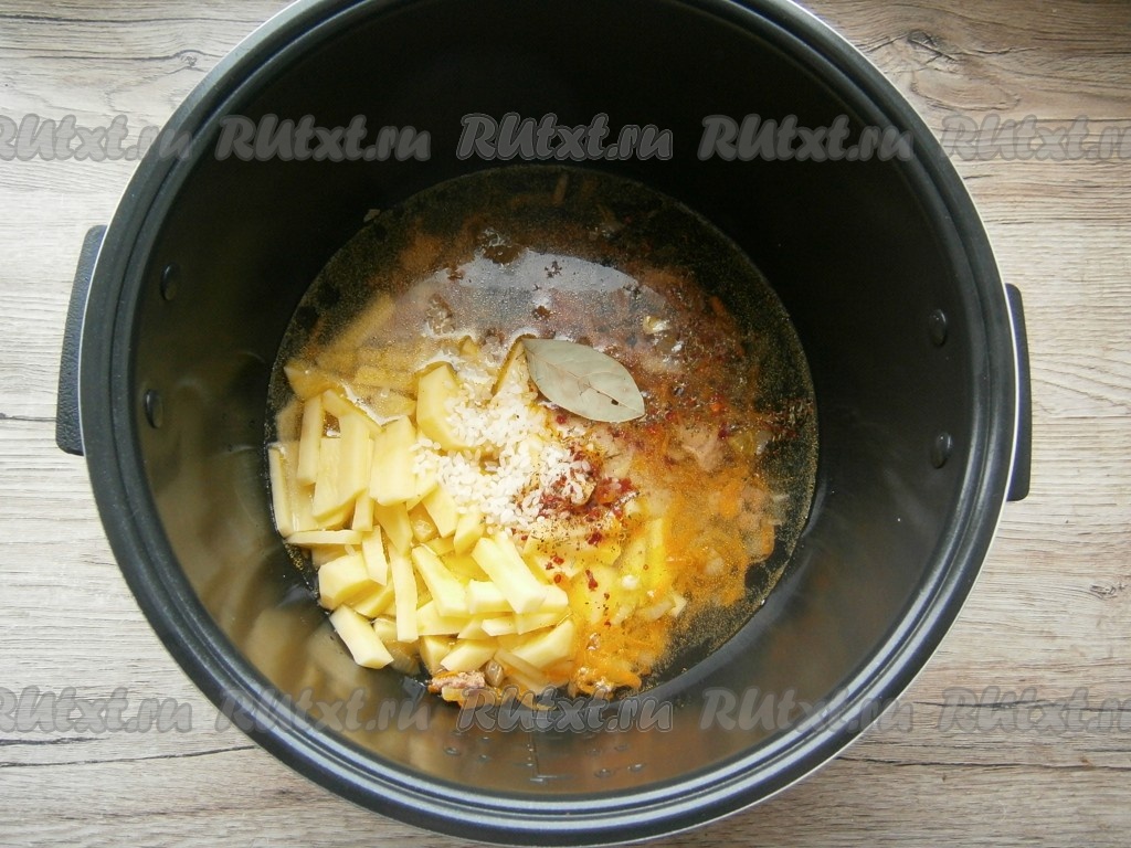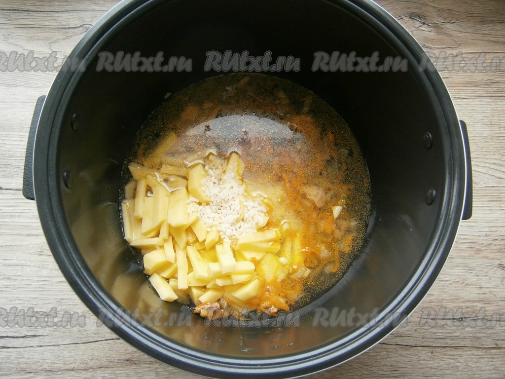 После сигнала добавить в чашу нарезанный картофель, всыпать рис, влить горячую воду.