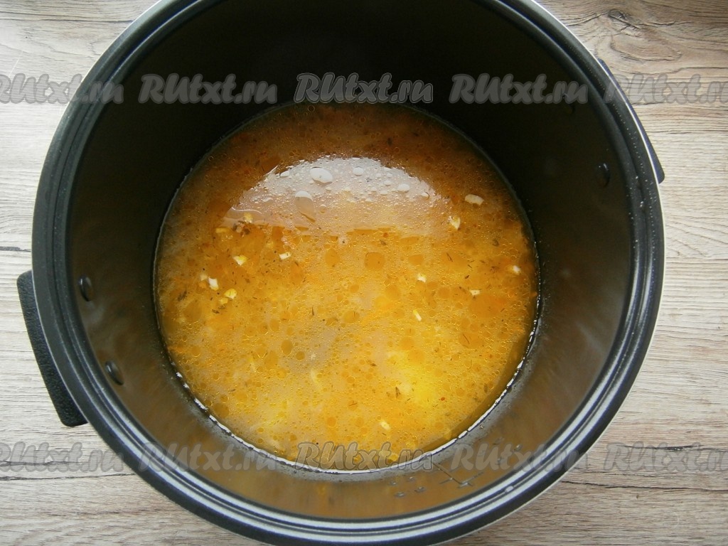 Выставить программу мультиварки "Суп" на 1 час. За 10 минут до готовности добавить измельченный чеснок в рисовый суп с фаршем.