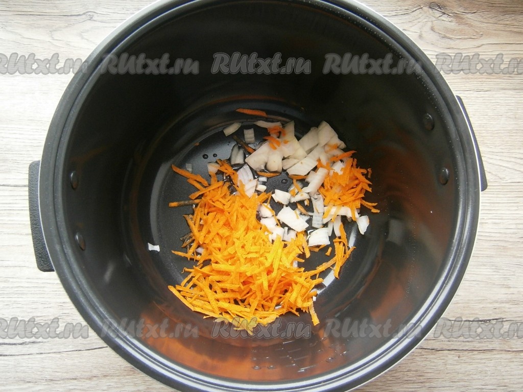 Морковку, лук, чеснок и картошку очистить. Влить в чашу мультиварки растительное масло, выложить лук, нарезанный некрупно, и натертую на крупной терке морковь.