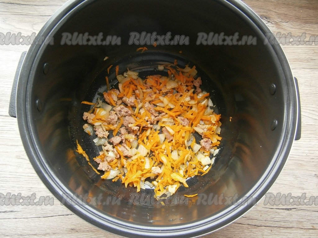 Выставить режим "Жарка" на 15 минут. Обжарить овощи, помешивая, 5 минут. Затем к морковке и луку выложить фарш и обжаривать, помешивая и разбивая мясные комочки, до сигнала.