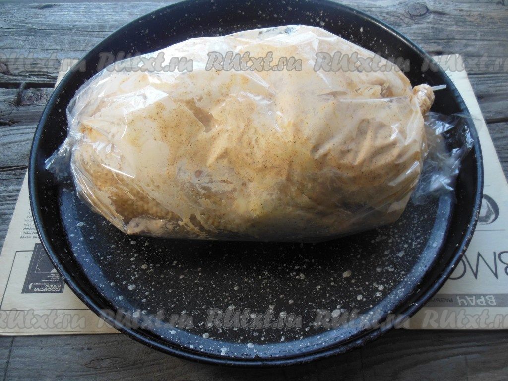 Яблоки разрежьте на 4 части, убрав сердцевину. Во внутрь брюшка вложите нарезанные яблоки. Затем поместите утку целиком в рукав для запекания. Завяжите рукав с двух сторон с помощью зажима или шпагата. Прокалывать рукав не нужно.