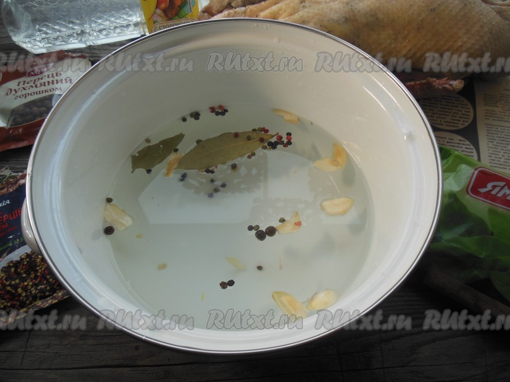 Для приготовления маринада соедините воду с лавровыми листьями, горошинами душистого перца и горошинами смеси перцев, поставьте на огонь и доведите до кипени, снимите с огня. Остудите воду со специями, затем добавьте очищенный и нарезанный чеснок, уксус, перемешайте получившийся маринад.