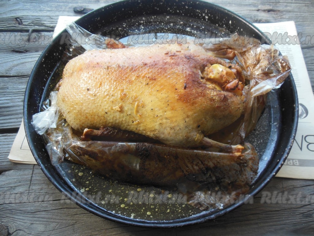 Запекайте утку в рукаве в разогретой духовке при температуре 170 градусов 1,5-2 часа. На каждый килограмм утки в среднем уходит 45 минут запекания в духовке. Через 1,5 часа достаньте противень из духовки, осторожно разрежьте рукав при помощи ножниц. Разверните рукав, полейте утку соком, отправьте в духовку и доведите до желаемой румяности.