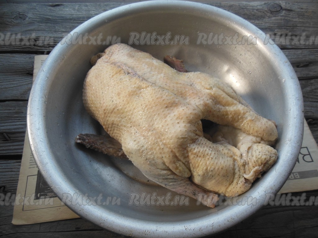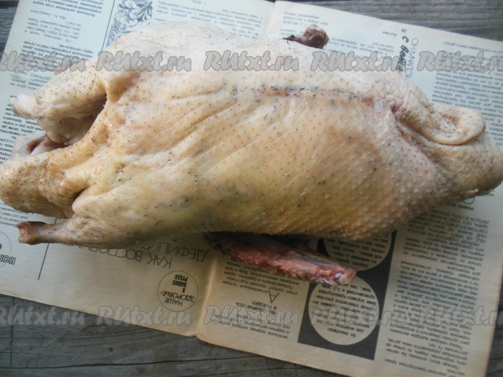 После двух суток маринования воду слейте, утку обсушите бумажными полотенцами.