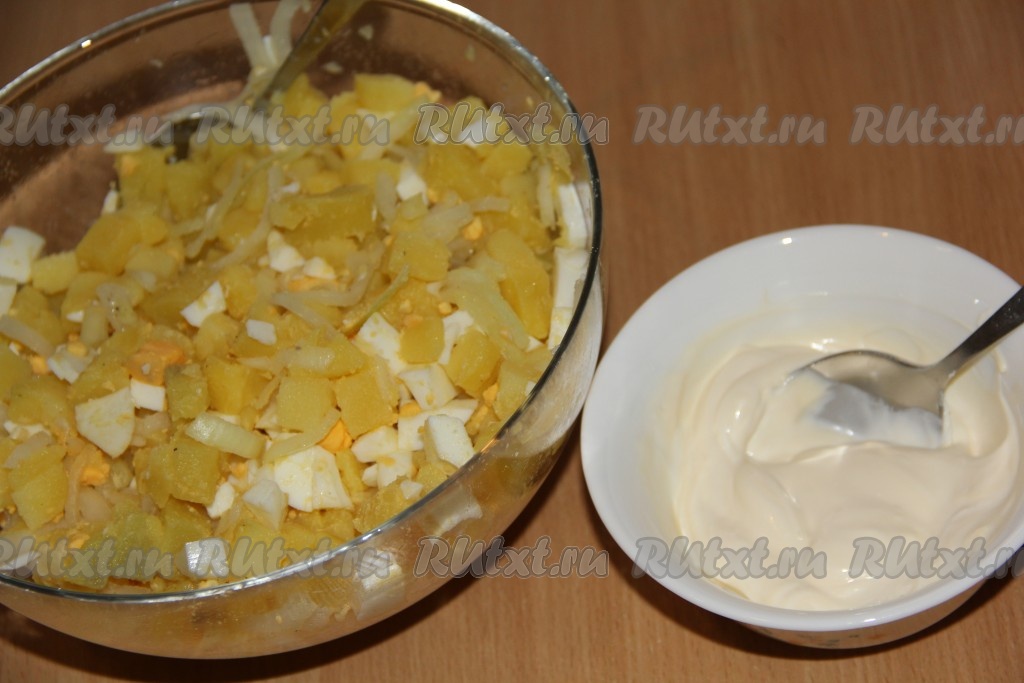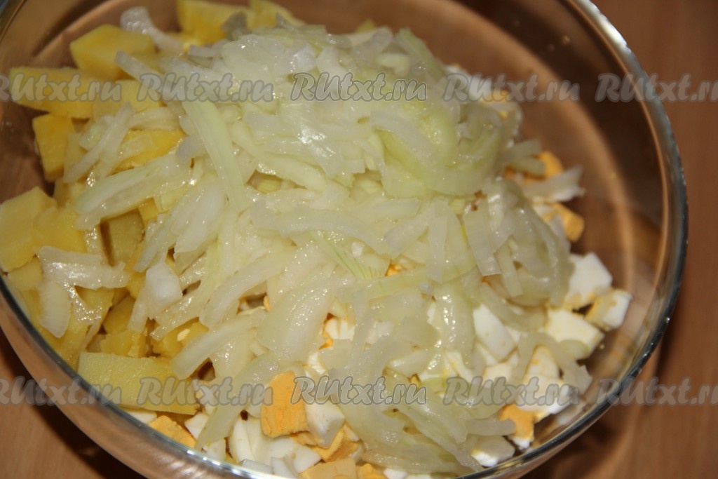 С лука слить маринад, добавить маринованный лук в салат из картофеля и яиц.