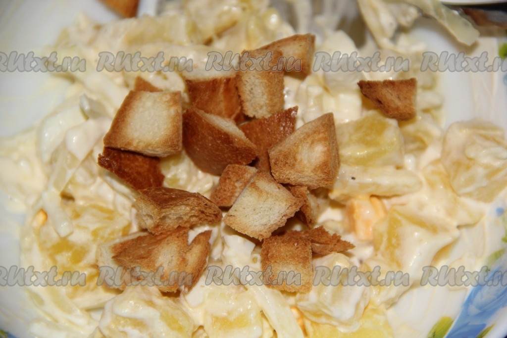 Перед подачей в картофельный салат с маринованным луком и яйцами добавить сухарики, заправить соусом из сметаны и майонеза, хорошо перемешать.