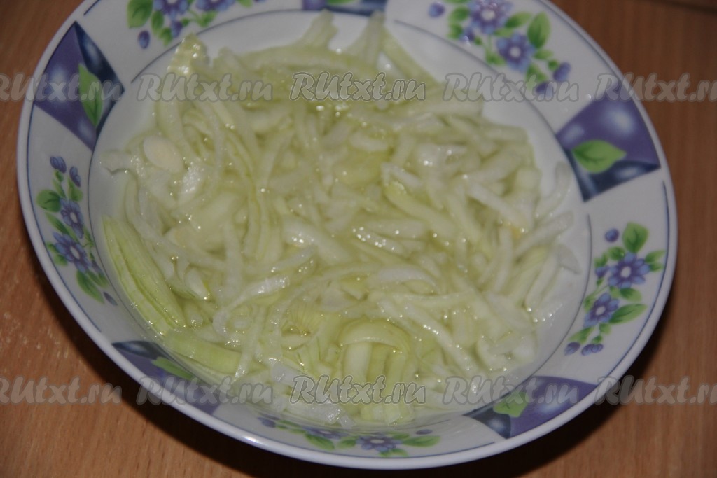 Очищенный лук, нарезанный на тонкие полукольца, замариновать в смеси воды, сахара и уксуса, оставить на 20-30 минут.