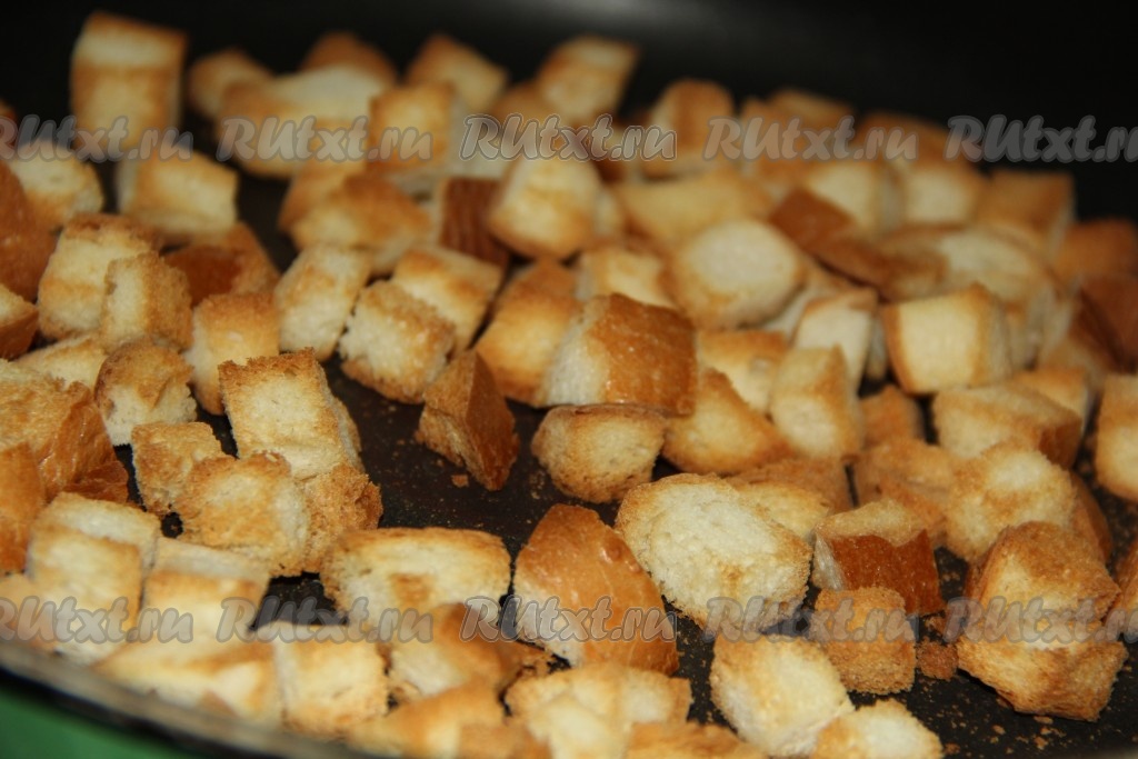 Белый хлеб нарезать на мелкие кубики, выложить на противень и поставить в разогретую до 200 градусов духовку. Подсушить сухарики до золотистого цвета (в течение минут 10) и остудить.