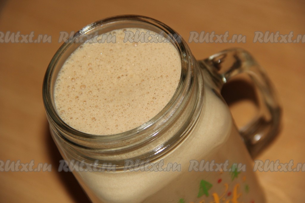 Влить молочно-шоколадную массу в чашу для взбивания. Взбить коктейль погружным блендером или миксером до пышной пенки (я взбивала минуты 3).