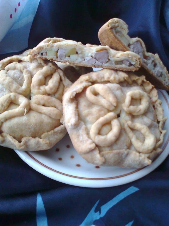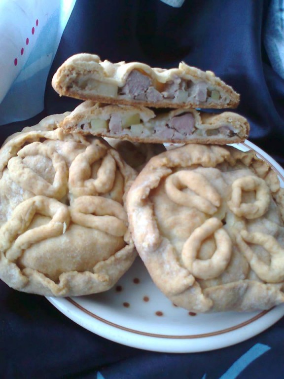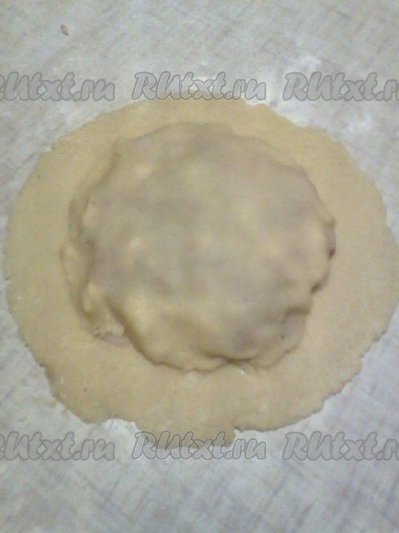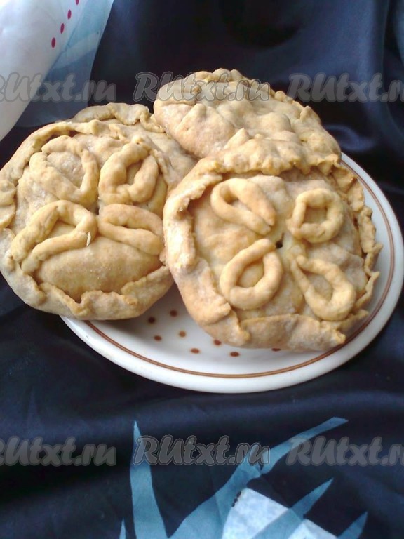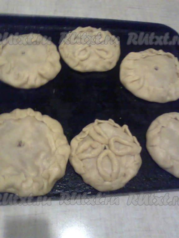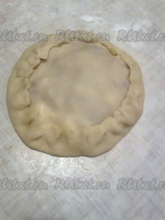 Смачивая края меньшей лепешки водой, приклеиваем их к основе курника (или плотно прижимаем). Собираем равномерно свободные края большей лепешки и, подтягивая края теста к верху и слегка защипывая, прижимаем к меньшей лепешке, формируя курник, как на фото. Таким же образом формируем курники из оставшихся 5 частей теста. В результате получится 6 курников.