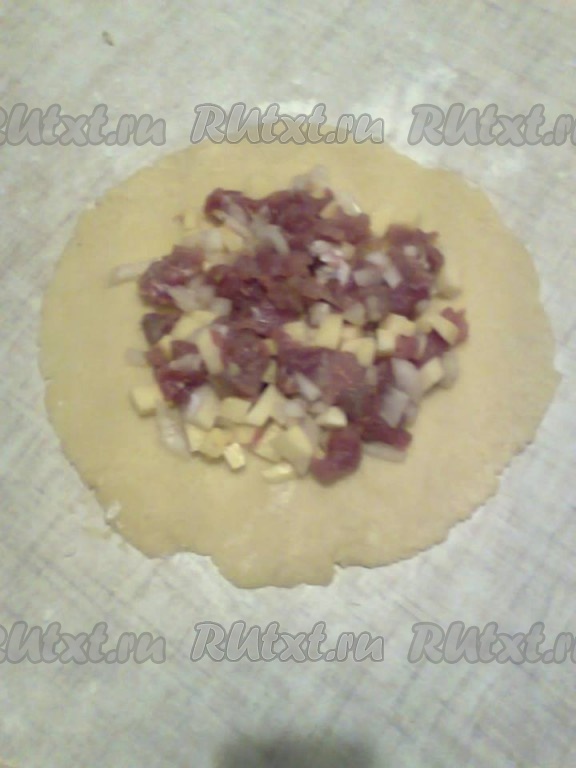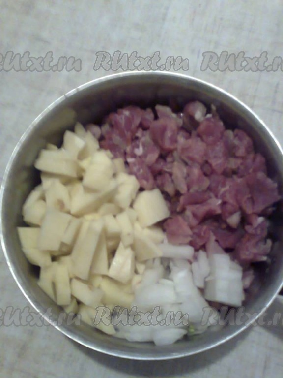 Мясо нарезаем некрупными квадратиками. Очищенные лук и сырой картофель нарезаем мелкими кубиками. Соединяем нарезанные мясо, лук и картофель, солим, перчим, тщательно перемешиваем и начинка для порционных курников готова.