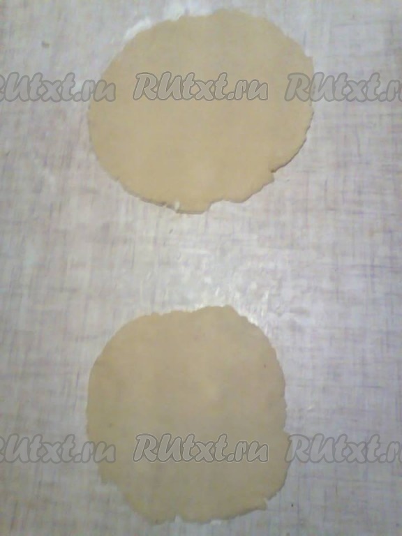 Одну часть теста делим еще на 2 части (большую и меньшую), скатываем их в шарики и тонко раскатываем в лепешки (получатся 2 лепешки большего и меньшего размера).