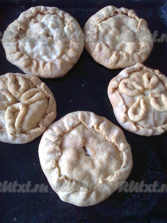 В центре каждого порционного курника делаем дырочку для выхода пара. Выкладываем пироги на слегка смазанный растительным маслом противень.