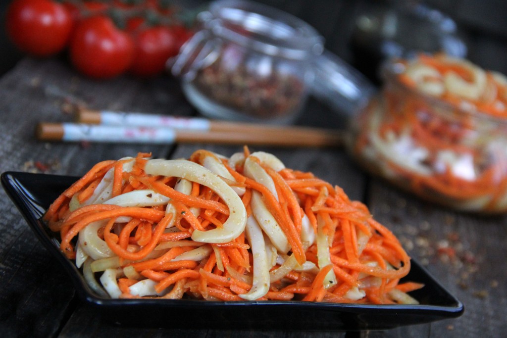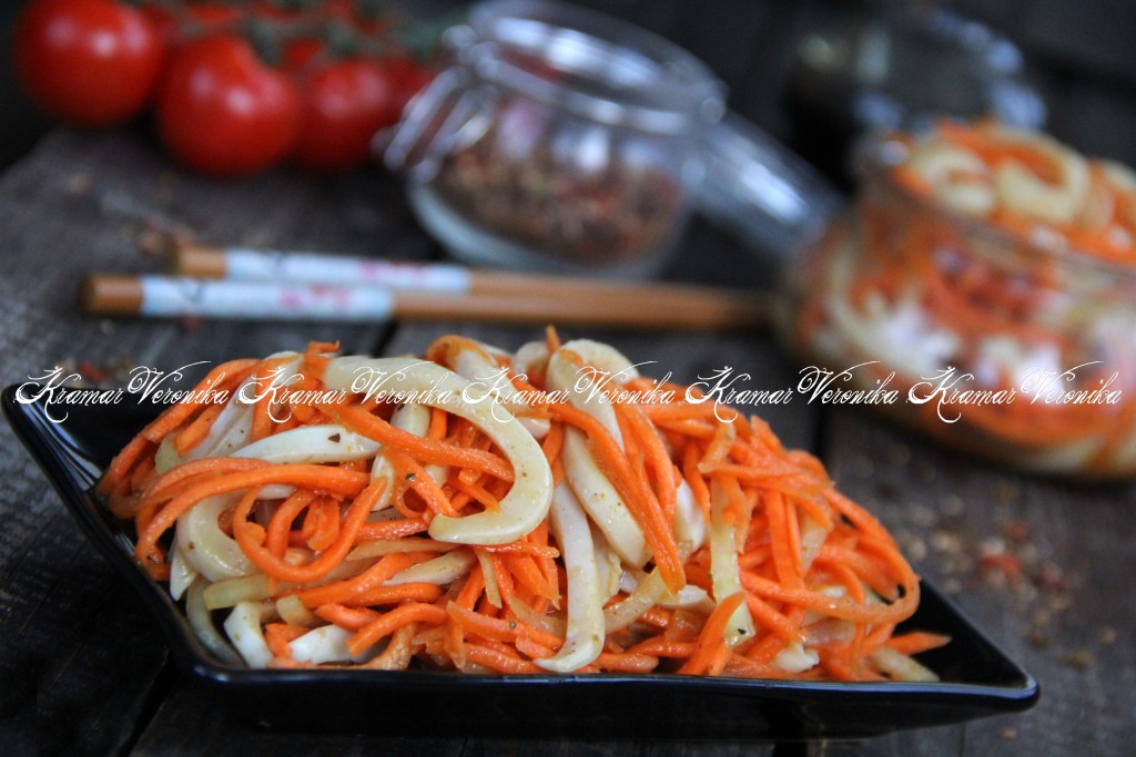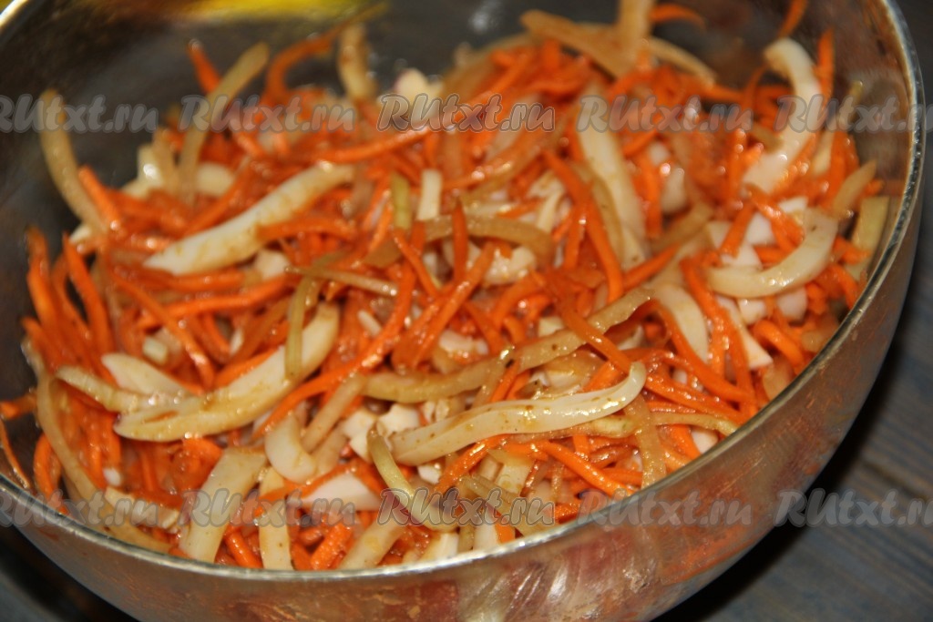 Тщательно перемешать кальмары с овощами. Затем влить уксус, соевый соус и масло. Хорошо перемешать хе и убрать в холодильник на 2-3 часа.