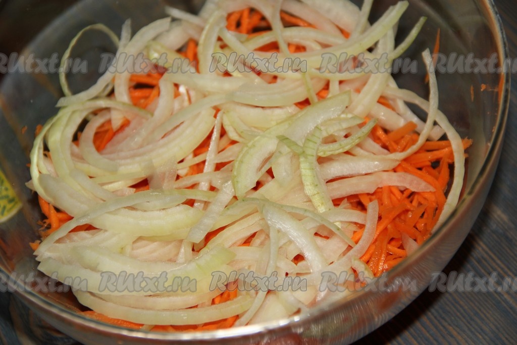 С моркови слить выделившуюся жидкость. Лук нарезать на тонкие полукольца и добавить к моркови.