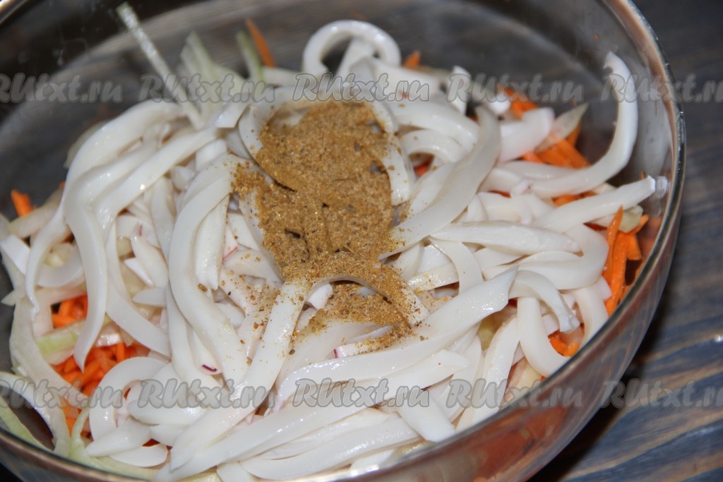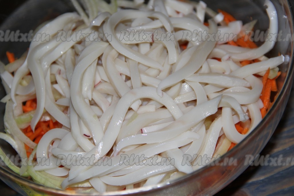 Кальмары нарезать на длинные полоски и добавить к овощам.