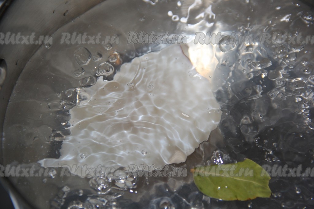 Чтобы отварить кальмаров, нужно поставить кастрюлю с водой на огонь, добавить 1 лавровый лист, довести воду до кипения. Опустить одну тушку кальмара в кипящую воду и варить 10 секунд с момента закипания. Достать тушку и выложить на тарелку. Снова подождать, когда вода хорошо закипит, опустить следующую тушку и варить 10 секунд. Готовые кальмары остудить. Если вы отварите кальмаров таким способом, то они будут мягкими, нежными и не резиновыми.